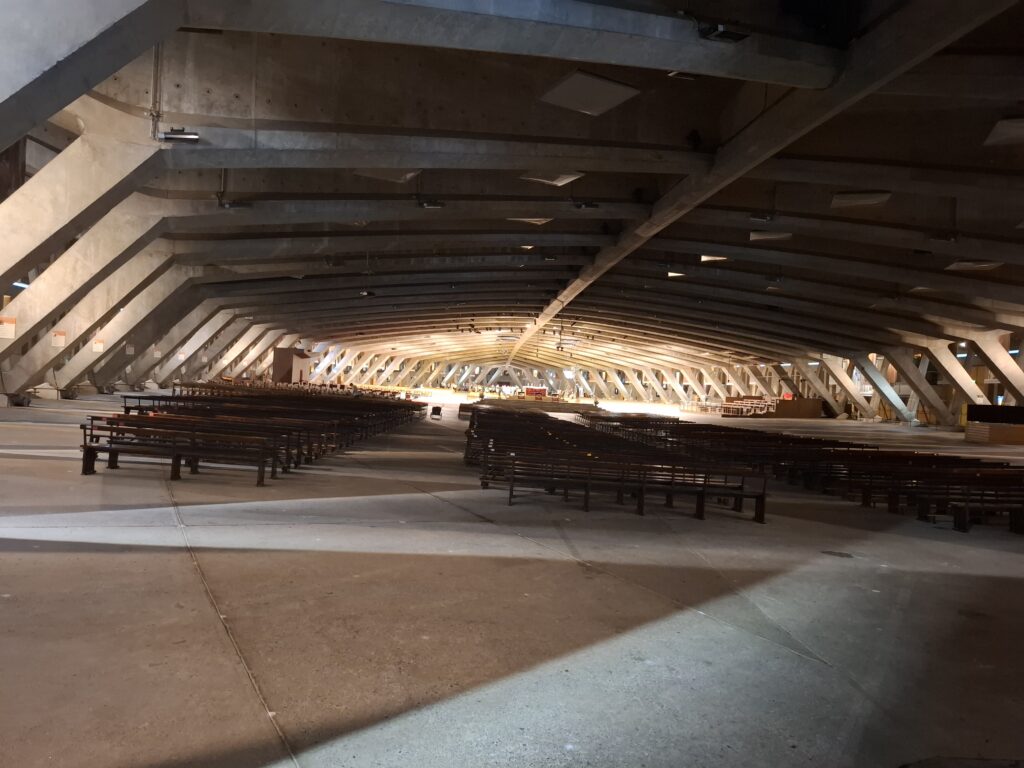 Es gibt eine unterirdische Kathedrale, die so groß ist, dass sagenhafte 25.000 Gläubige da drin Platz haben. Sie hat eine innere Form, welche an ein Schiff erinnert und es gibt ringsum einen Balkon. Am Balkon und unten bei den Sitzbänken gibt es viele Bilder von katholischen Heiligen. Wir kommen ergo auf die Idee das Bild von Padre Pio zu suchen finden es aber nicht am Balkon und unten findet gerade ein Gottesdienst statt. Als der zu Ende ist gehen wir runter und suchen auch dort – und finden ihn. Padre Pio hat einmal in Atlans Leben eine durchaus relevante Rolle gespielt.