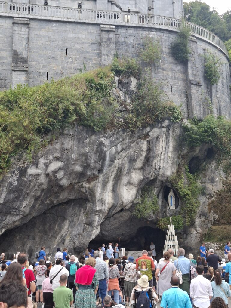 Insgesamt gibt es 3 relevante Kirchen. Die unterirdische Basilika „Pius X“ ist nur eine davon. Direkt über Grotte (welche eigentlich nur eine Art überhängender Felsen ist), gibt es die „Rosenkranzbasilika“ sowie etwas dahinter die „Chapelle de la Visitation“. Wir sehen uns auch die Beiden an, aber dann sind wir müde und abgefüllt mit Eindrücken. Obwohl Atlan dem ganzen Kommerz ringsum im Allgemeinen und der Heiligenverehrung im Speziellen sehr reserviert gegenüber steht ist er doch beeindruckt von der Inbrunst und der inneren Überzeugung der Pilger. Das verlangt Respekt. Atlan zeigt dann Mara noch, bis wohin die verheerenden Überschwemmungen im Jahr 2017 gingen. Etwas abseits gibt es dann einen längsgezogenen Bau, wo wir eine Kerze anzünden können für unsere Lieben, welche nicht mehr unter uns weilen. Wir können sehen, dass sich sehr diszipliniert eine lange Schlange gebildet hat, um die Grotte der Hl. Bernadette Soubirous betreten zu können – dort wo ihr angeblich Maria erschienen ist. Im Moment findet gerade ein Gottesdienst statt.
