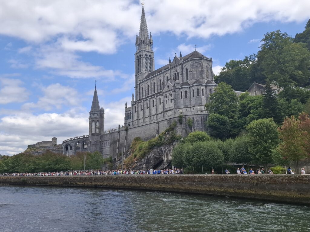 Der Bus bringt uns pünktlich nach LOURDES und bleibt am Busbahnhof stehen. Um zur Kathedrale zu kommen, müssen wir erstmal unsere Handis zu Rate ziehen und den Hang durch die Altstadt von LOURDES runter zum Fluss Pau gehen. Atlan war zwar schon mal in LOURDES, aber da war gerade ein Jahrhunderthochwasser und es hat viel geregnet. Dementsprechend niedrig war damals auch die Motivation zu größeren Erkundungen. Für Mara andererseits war LOURDES ein Wunschziel. Überraschenderweise ist LOURDES gemäß der Anzahl von Hotelbetten die zweitgrößte Stadt nach PARIS in ganz FRANKREICH – Touristen und Gläubige en masse und überall.