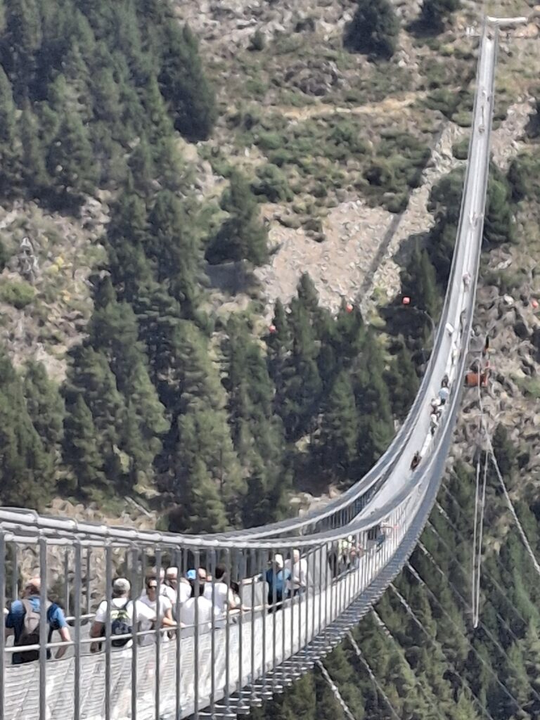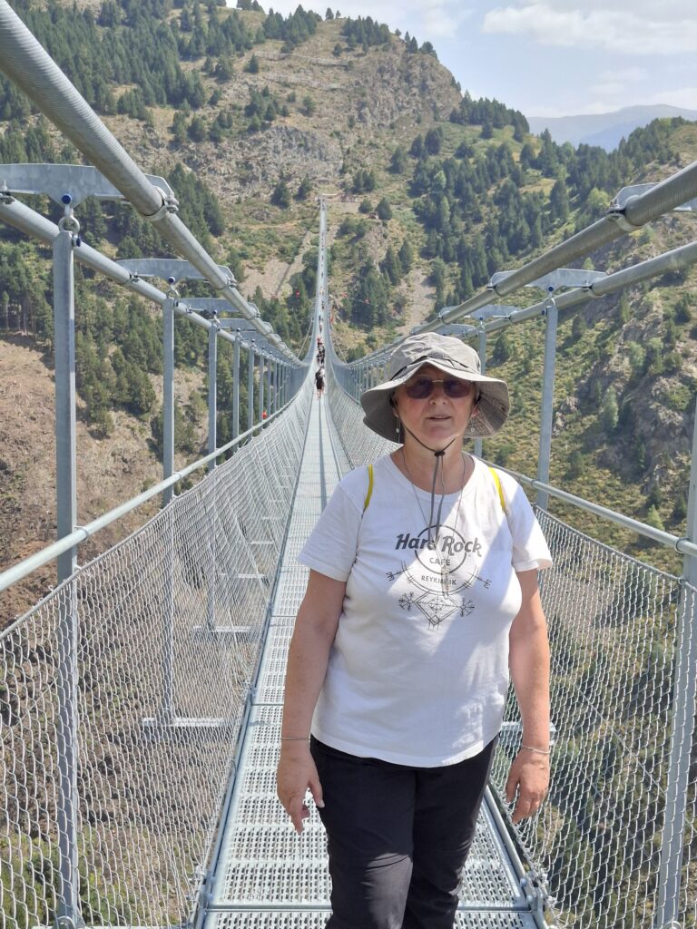 Mara hat sich was besonderes gewünscht: Es gibt in ANDORRA die „Pont Tibetà Canillo“, eine Hängebrücke nur für Fußgänger, welche über 600 Meter lang ist, praktisch nur aus Stahlseilen besteht und wo es an der höchsten Stelle mehr als 150 Meter in die Tiefe geht. Diese Attraktion gibt es erst seit 2022 und Mara hat bereits für uns Tickets übers Internet gekauft. Nach dem Frühstück im Hotel setzen wir uns auf die SOL und fahren nach CANILLO, wo wir erst einmal einen Parkplatz finden müssen. Es gibt dort einen Automaten für Parktickets, aber der wird von Allen ignoriert. Ergo stellen wir auch wir die SOL ohne Parkticket dort ab und verpacken unsere Motorradklamotten in einen IKEA-Sack, der mit einem Stahlnetz gesichert ist. Anschließend müssen wir in der Hitze auf einen Zubringerbus warten, der uns dann irgendwo am Berg aussteigen lässt. Wir gehen erstmal die breite Schotterstraße immer weiter den Berg hinauf und haben dabei eine wunderschöne Aussicht auf das Tal von ANDORRA. Als wir schließlich bei der Brücke ankommen, sehen wir, dass es ein reges Kommen und Gehen über der Brücke gibt und wollen ebenfalls drüber gehen.