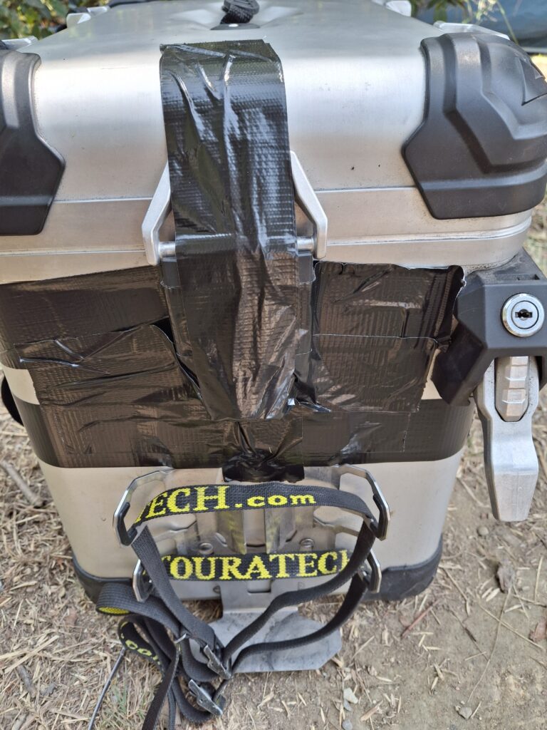 Zurück am Campingplatz wird erstmal das Tarp aufgebaut und dann der Seitenkoffer behelfsmäßig repariert. Wobei sich das Schloss hier für uns als irreparabel herausstellt: Ein Kunststoffteil ist abgebrochen. Atlan fixiert den Verschluss mit Duck Tape, sodas er einerseits zu ist und andererseits der Koffer nicht versehentlich hier geöffnet wird.