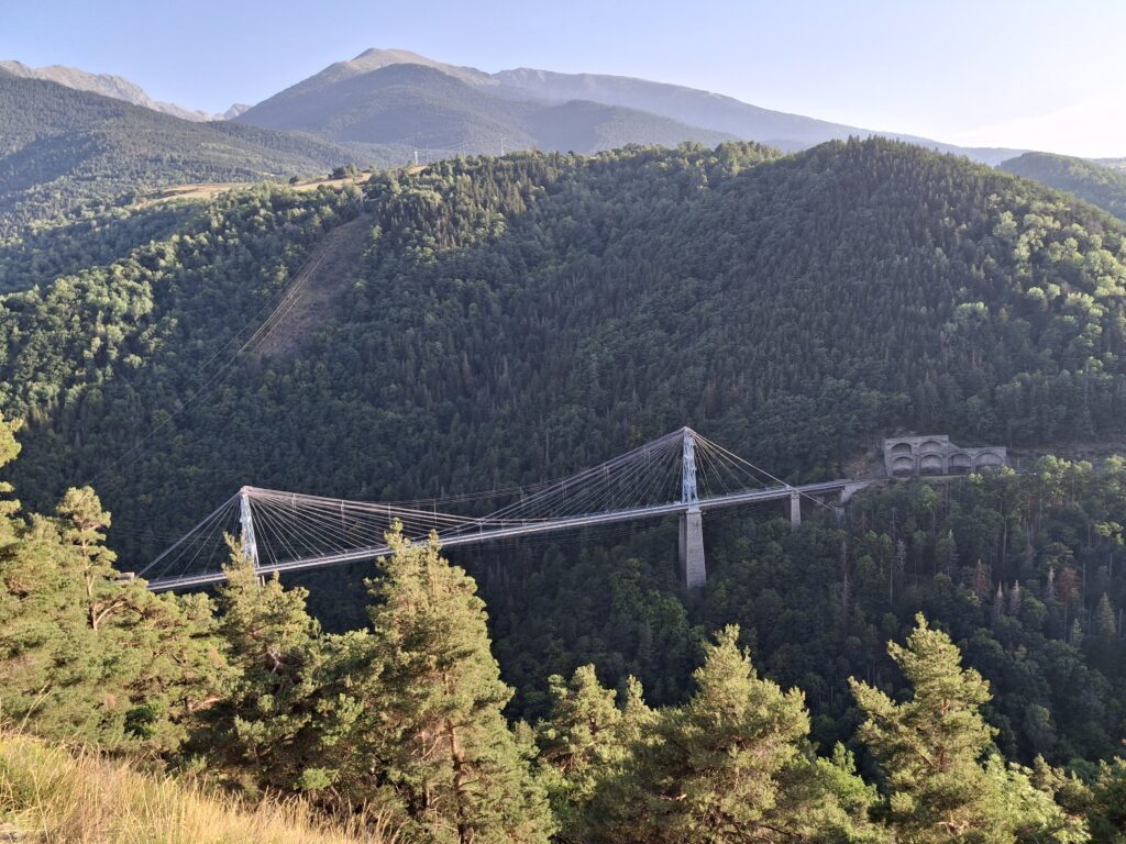 Auf dem Rückweg gönnen wir uns noch einen Fotostopp für die wunderschöne Pont Gisclard. Sie spannt sich über das Tal der Têt und ist ein besonders imposantes Bauwerk auf der Strecke der gelben Bahn – „Le Train Jaune“ bzw. die „Ligne de Cerdagne“ wurde gebaut, um die Infrastruktur hier im Süden Frankreichs zu verbessern. Sie ist eine elektrisch betriebene Schmalspur-Gebirgsbahn, die sich hinaufschlängelt bis auf 1.592 m und nach 62,5 km im französischen Grenzbahnhof Latour-de-Carol – Enveitg Anknüpfung nach Toulouse und Barcelona bietet. Gestern auf dem Weg zum Col de Puymorens sind wir an diesem Bahnhof vorbeigefahren ohne zu ahnen, dass hier 3 Bahnstrecken mit 3 unterschiedliche Spurbreiten aufeinandertreffen: Die französische Normalspurahn von Toulouse kommend, die spanische Breistpurbahn aus Barcelona kommend und die Schmalspurbahn durch das Tal der Têt.