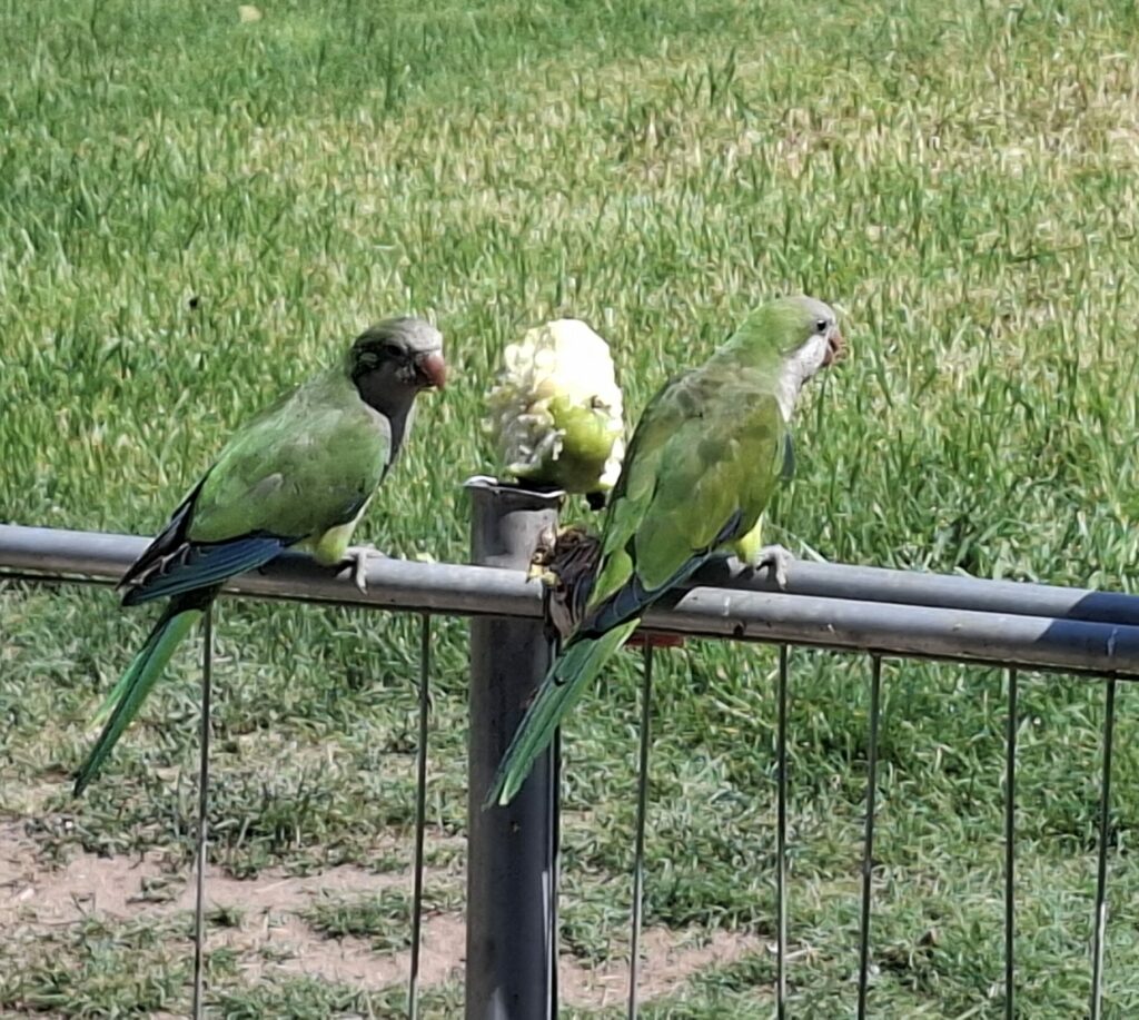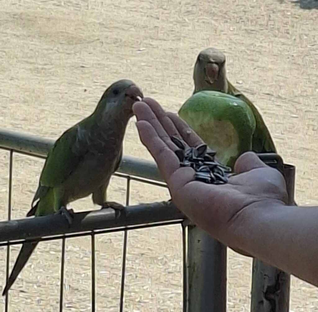 Mara will schwimmen gehen. Wir packen ergo unsere Sachen und machen uns in der Mittagshitze auf den Weg zum Strand. In der schwühlen Hitze marschieren wir brav durch die Innenstadt und kommen an einer großen Plaza vorbei. Dort sind offenbar vor einiger Zeit Papageien entkommen, haben sich in der urbanen Umgebung wohlgefühlt und sich enorm vermehrt. Die brauchen garnicht nach Futter suchen, denn es gibt genügen Touristen, denen sie wortwörtlich aus der Hand fressen. Mittlerweise sind es so viele, dass sich die Stadt schon Maßnahmen überlegt, wie man die schiere Anzahl im Griff halten kann.
