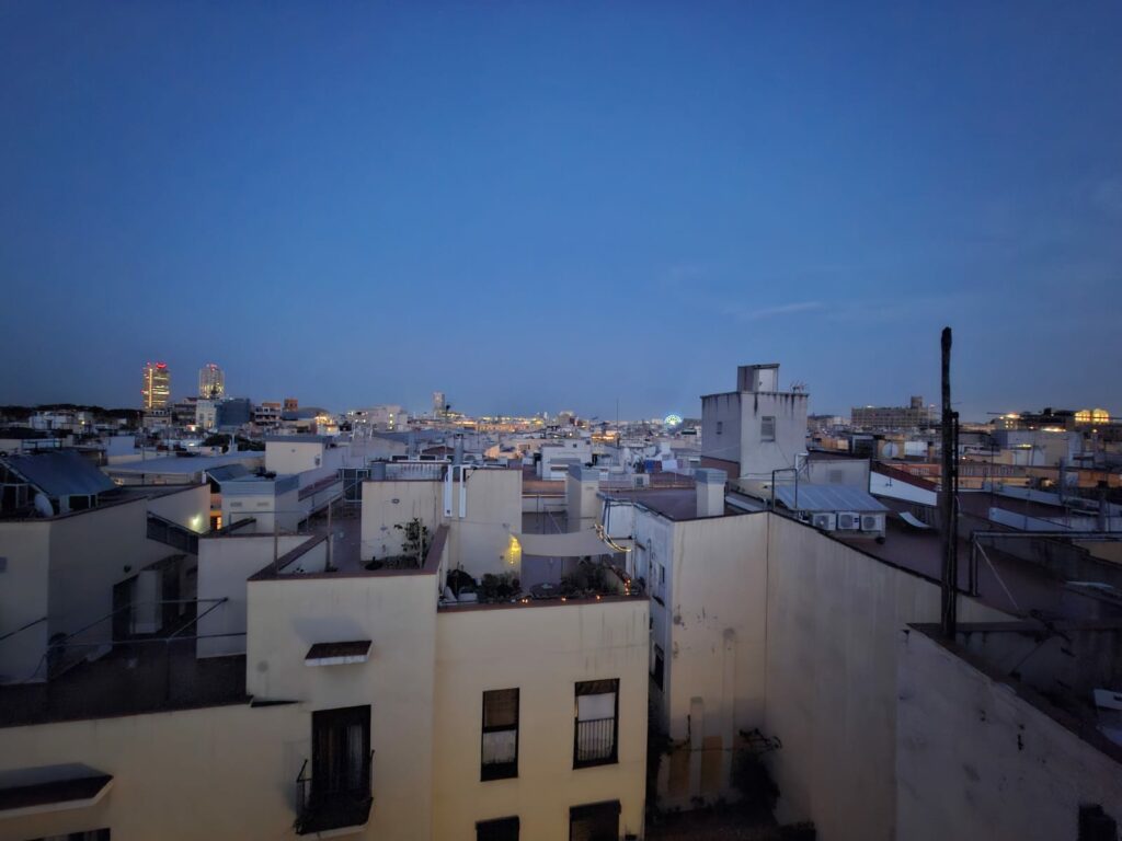 Wider Erwarten ist die Wäsche in der schwühlen Luft noch nicht ganz trocken. Auf der Dachterrasse, welche Mara gestern entdeckt hat bewundern wir wieder den Sonnenuntergang und gönnen uns noch ein wenig Obst, Brot, Käse und Prociutto – unser Abendessen.