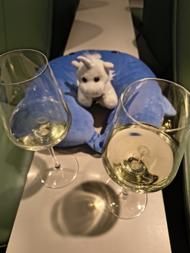 Der Tauchkoffer ist gepackt und die Waage zeigt knapp unter 25 kg an. Der Rucksack als Handgepäck mit dem Notebook drin kommt auf 8 kg. Der freundliche Mitarbeiter von Qatar Air sieht das als passend an und so kann ich endlich meine Kabinenkollegin Siegrid kennenlernen. Wir bringen alle Checks hinter uns und starten mit einem Glas Prosecco in unser Abenteuer.