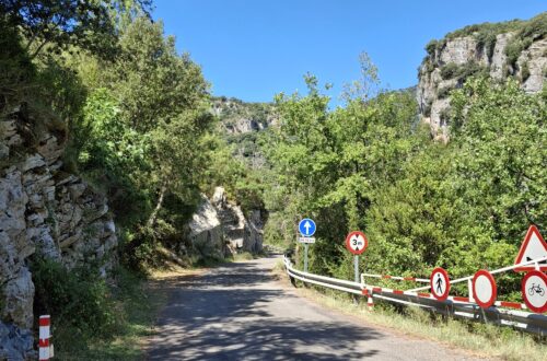 Heute erkunden wir die Georges de Galamus. Der Rückweg führt vorbei an den stolzen Katharerburgen Peyrepertuse und Queribus über gewundene Straßen zurück zu unserem Zeltplatz in Prades.